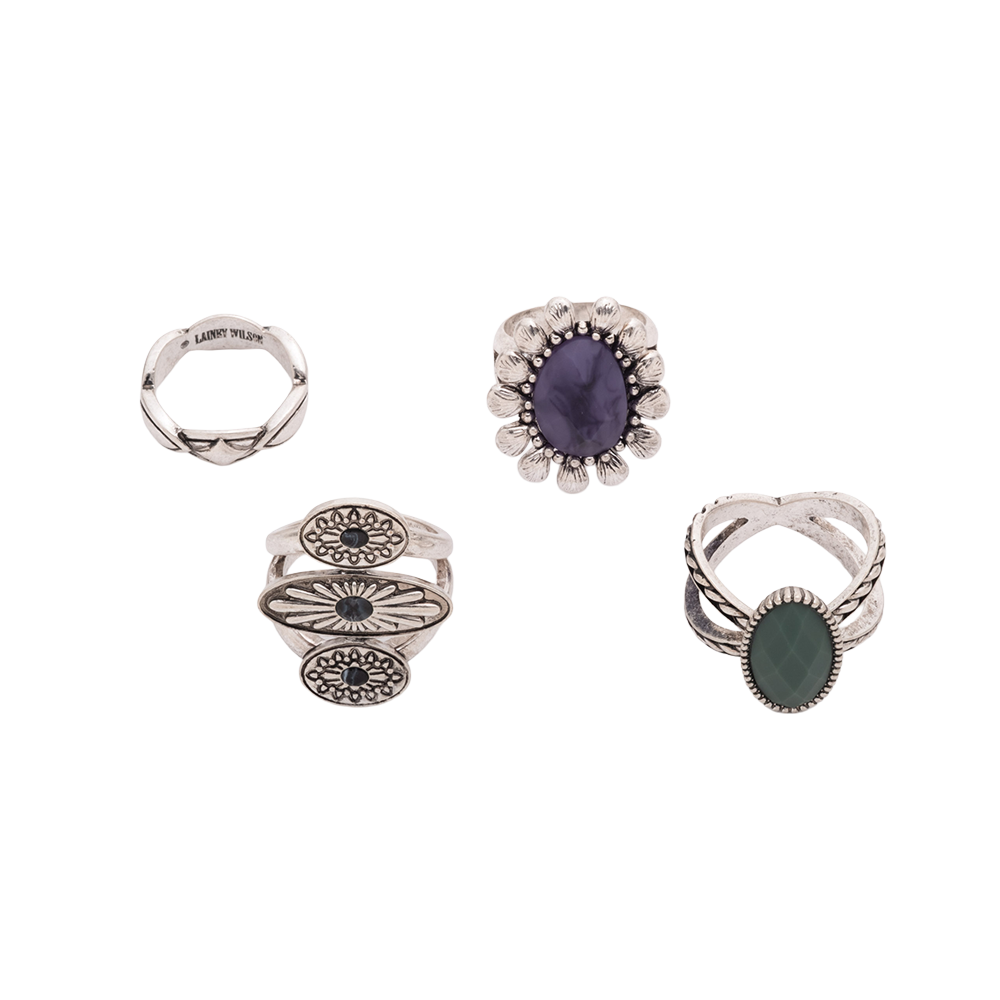 Elevate your accessory game with the Lainey Wilson set of 4 stone statement rings. Each ring features a bold, vibrant stone and showcases unique, western-inspired designs that capture Lainey’s fearless, modern style. Ranging in sizes from 6 to 9, this set offers mix-and-match versatility—perfect for stacking, layering, or wearing individually as a standout piece. Add color, edge, and personality to any outfit with this signature collection of statement rings.